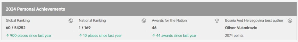 Na Hall of Fame stranici IAAP – International Association of Art Photographers za 2024. godinu Proglašen za najboljeg autora iz BiH gdje je u ukupnoj konkurenciji od 169 autora iz BiH zauzeo prvo mjesto a u globalnoj konkurenciji od 54252 autora iz cijelog svijeta zauzeo 60 mjesto, te ušao u top 100 autora iz cijelog svijeta.