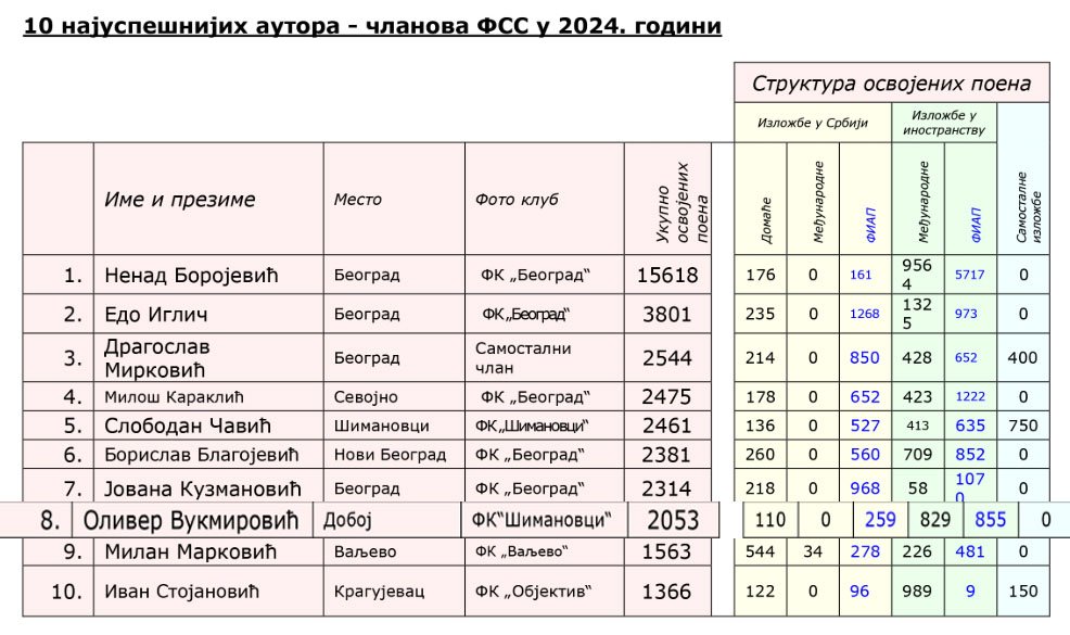 Član Fotografskog saveza Srbije (FSS) od 2022.godine. Takođe, u 2024.godini ostvaruje veliki uspjeh i ulazi u top 10 autora u Srbiji zauzevši 8. mjesto.